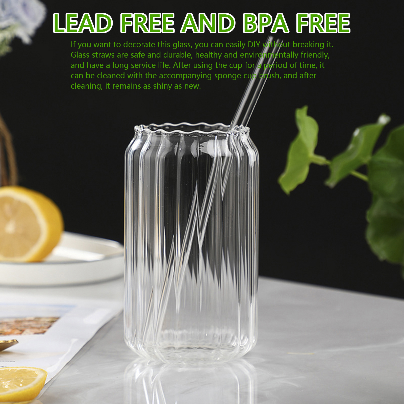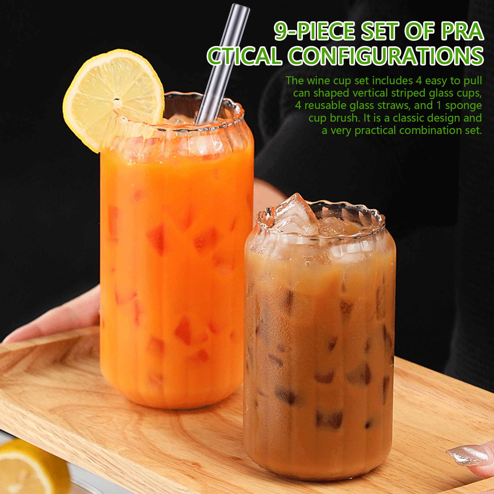 [Total 9 Pcs Glass Cups Kit] This glass tumbler set includes 4 can-shaped striped glass cups, 4 reusable glass straws, and 1 sponge cup brush (random color), which is a very practical combination set.