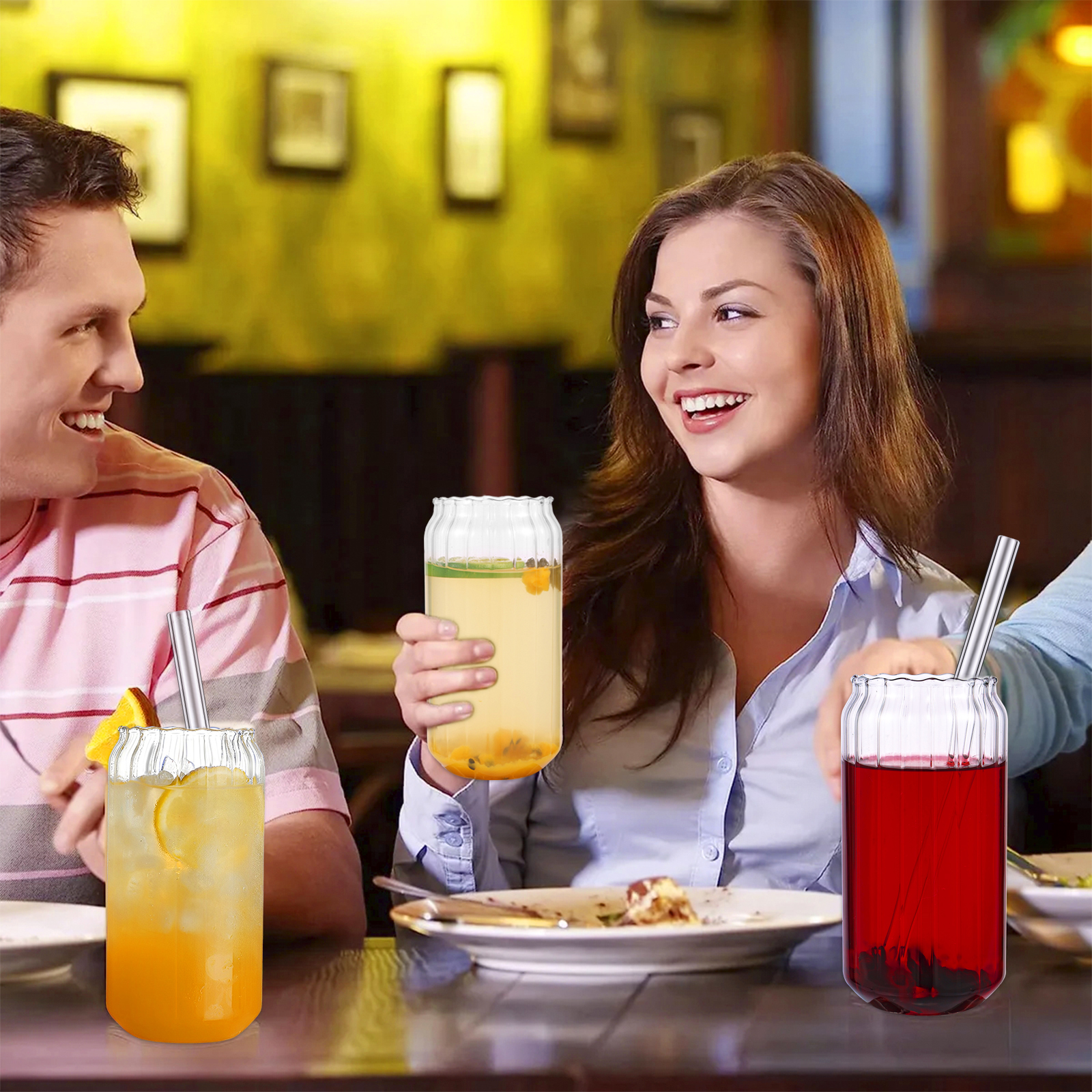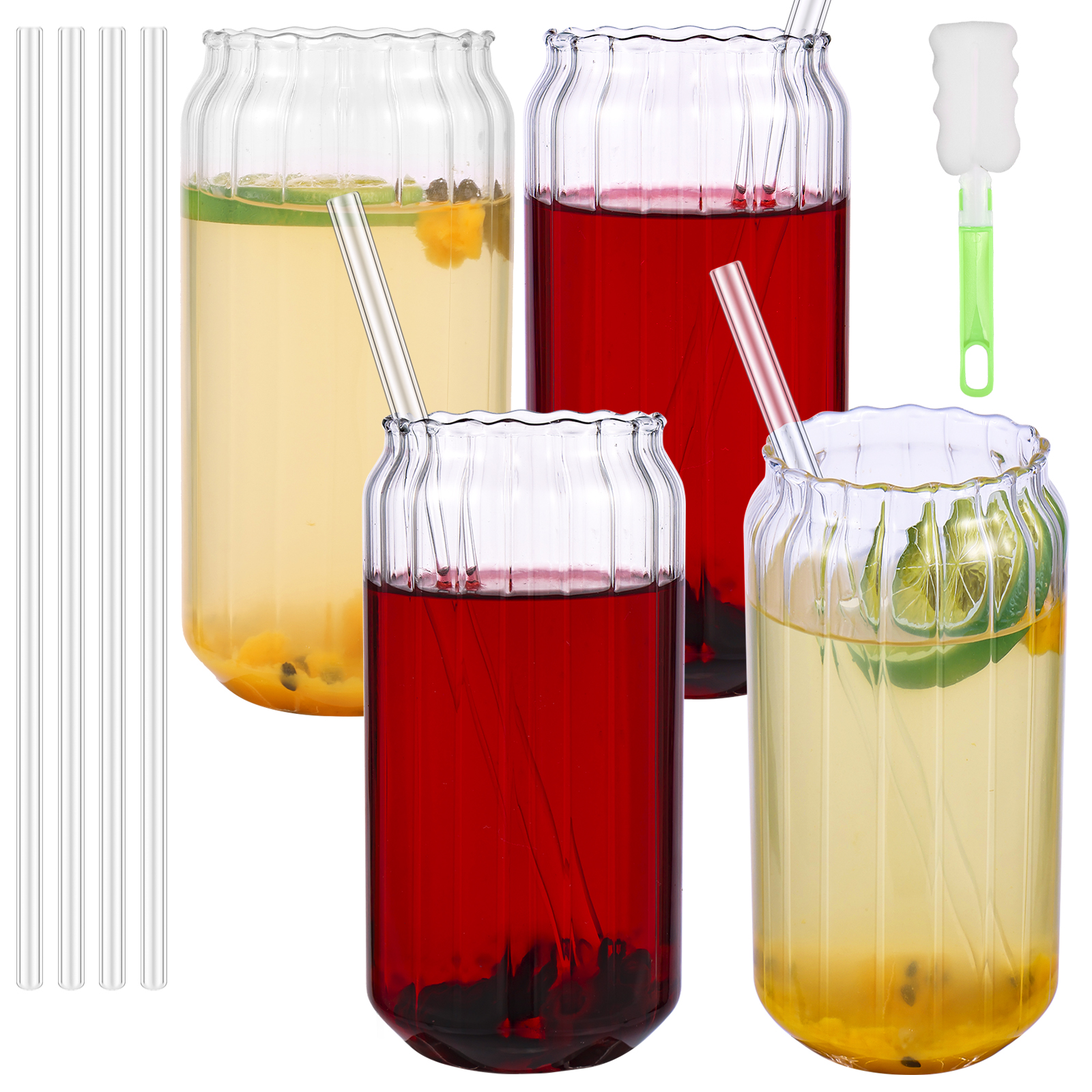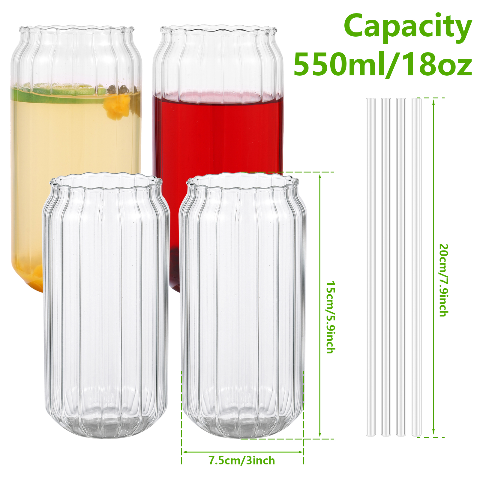 4 Pcs Glass Cups 550ml Drinking Glass Tumbler with Glass Straws Cup Brush Vintage Ribbed Drinking Glass Cup Temperature
