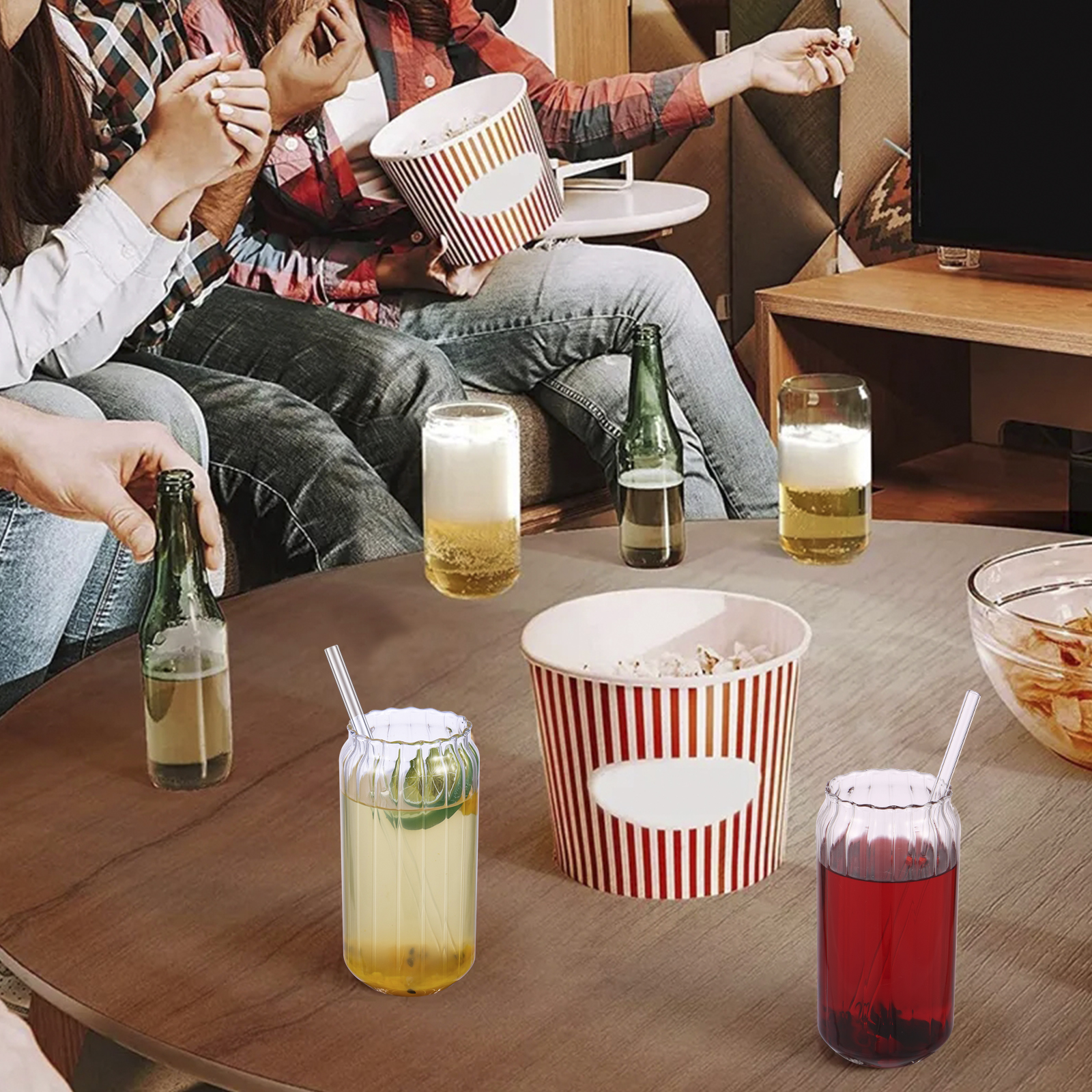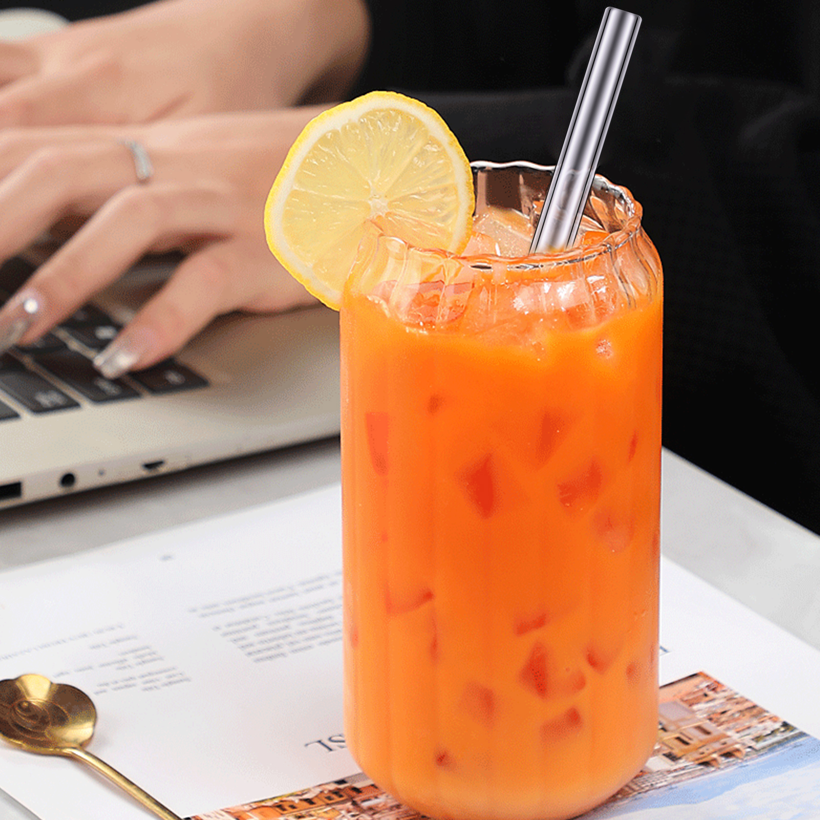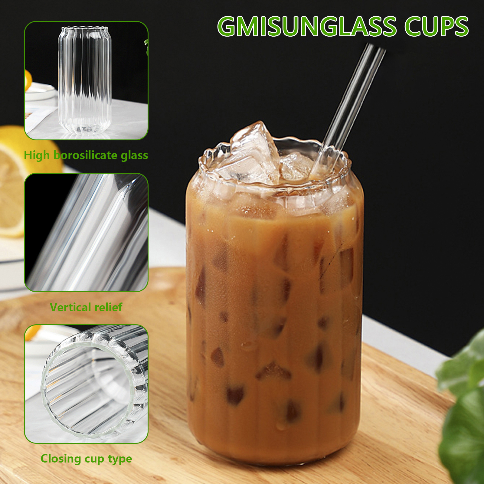 4 Pcs Glass Cups 550ml Drinking Glass Tumbler with Glass Straws Cup Brush Vintage Ribbed Drinking Glass Cup Temperature