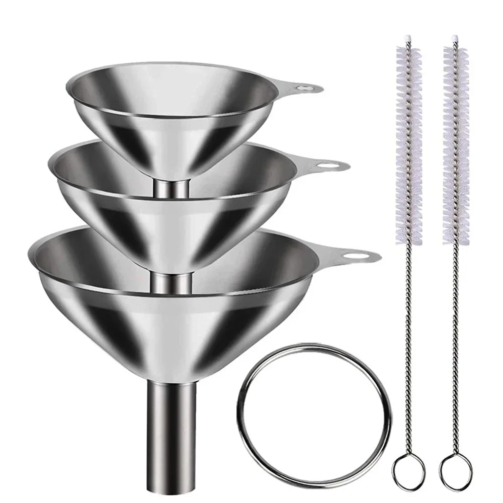 Viene con embudos de cocina de 3/5 piezas (grandes, medianos, pequeños) junto con un anillo, más 2 cepillos de limpieza de embudo de piezas, mini embudos geniales para llenar botellas y uso en la cocina