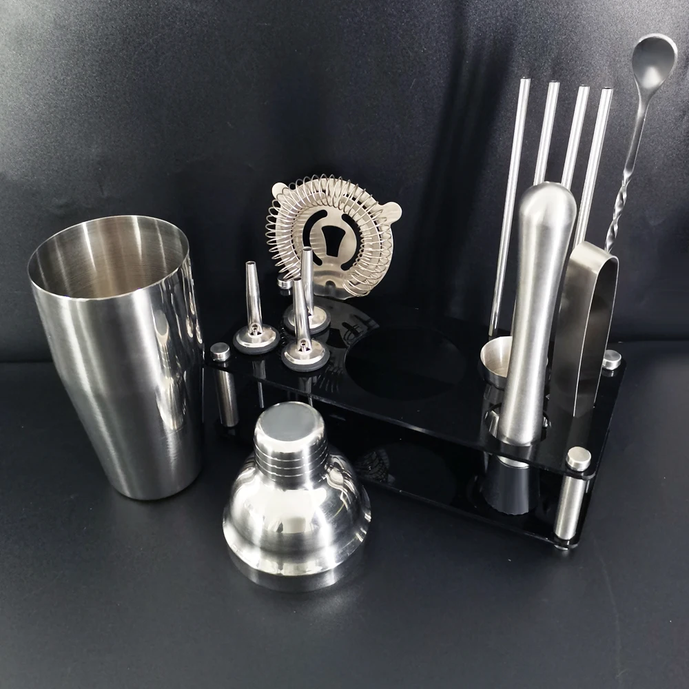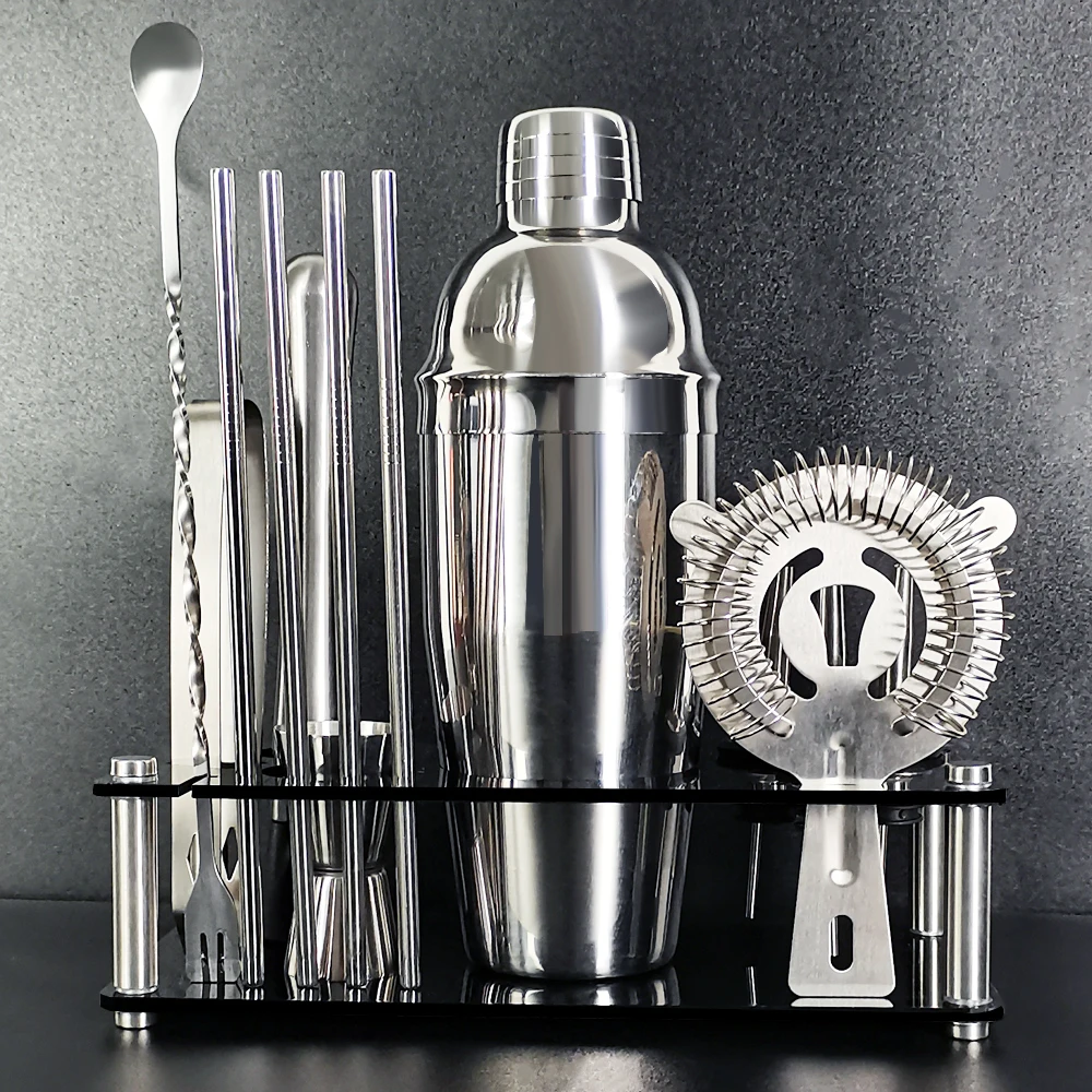 Opciones D: 1 x Silver 750ml Shaker Cup, 1 x Muddler, 1 x Colador de hielo, 1 x Pinzas de hielo, 1 x Cuchara de barra, 3 x Pourer, 4 x Paja recta, 1×15/30ml Jigger, 1 x receta de cóctel, 1 x soporte acílico negro.